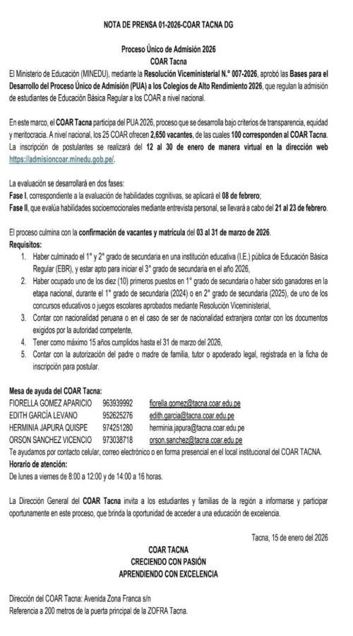| 209 | NOTA DE PRENSA 01-2026-COAR TACNA DG | 01-15-2026 | |