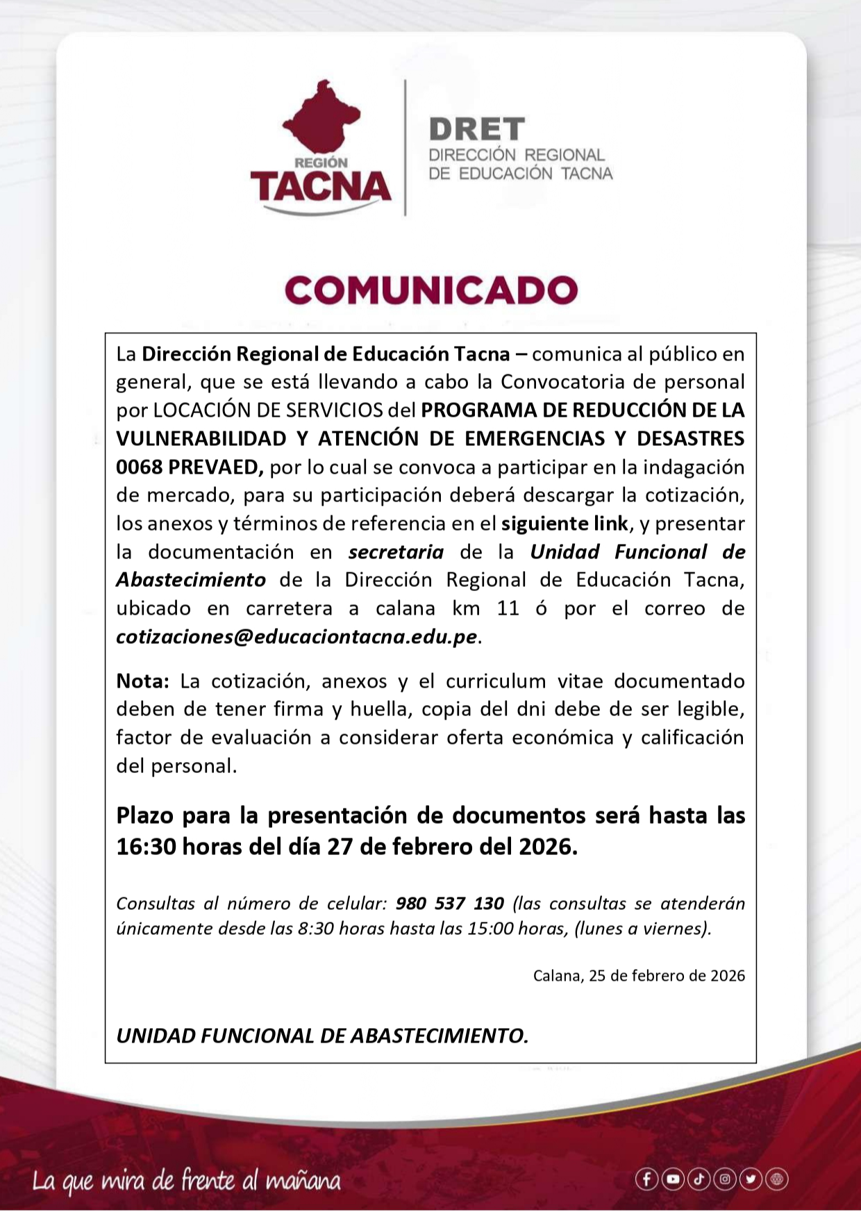 | 214 | COMUNICADO CONVOCATORIA PREVAED 2026 Ver Enlace | 02-25-2026 |