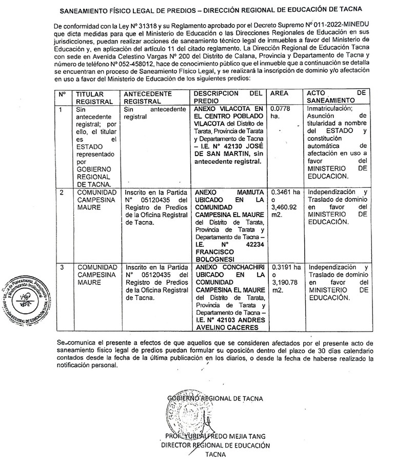| 228 | Dar Clic (aquí) Consultoría para la Elaboración de Diagnostico, para la Dirección de Gestión Pedagógica de la Dret, para la " Formulación Del Currículo Regional de Tacna" Ver Enlace | 04-14-2026 | |