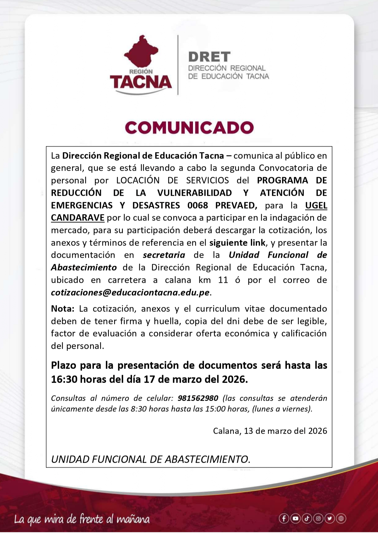 | 217 | COMUNICADO SEGUNDA CONVOCATORIA PREVAED CANDARAVE 2026 Ver Enlace | 03-13-2026 | |