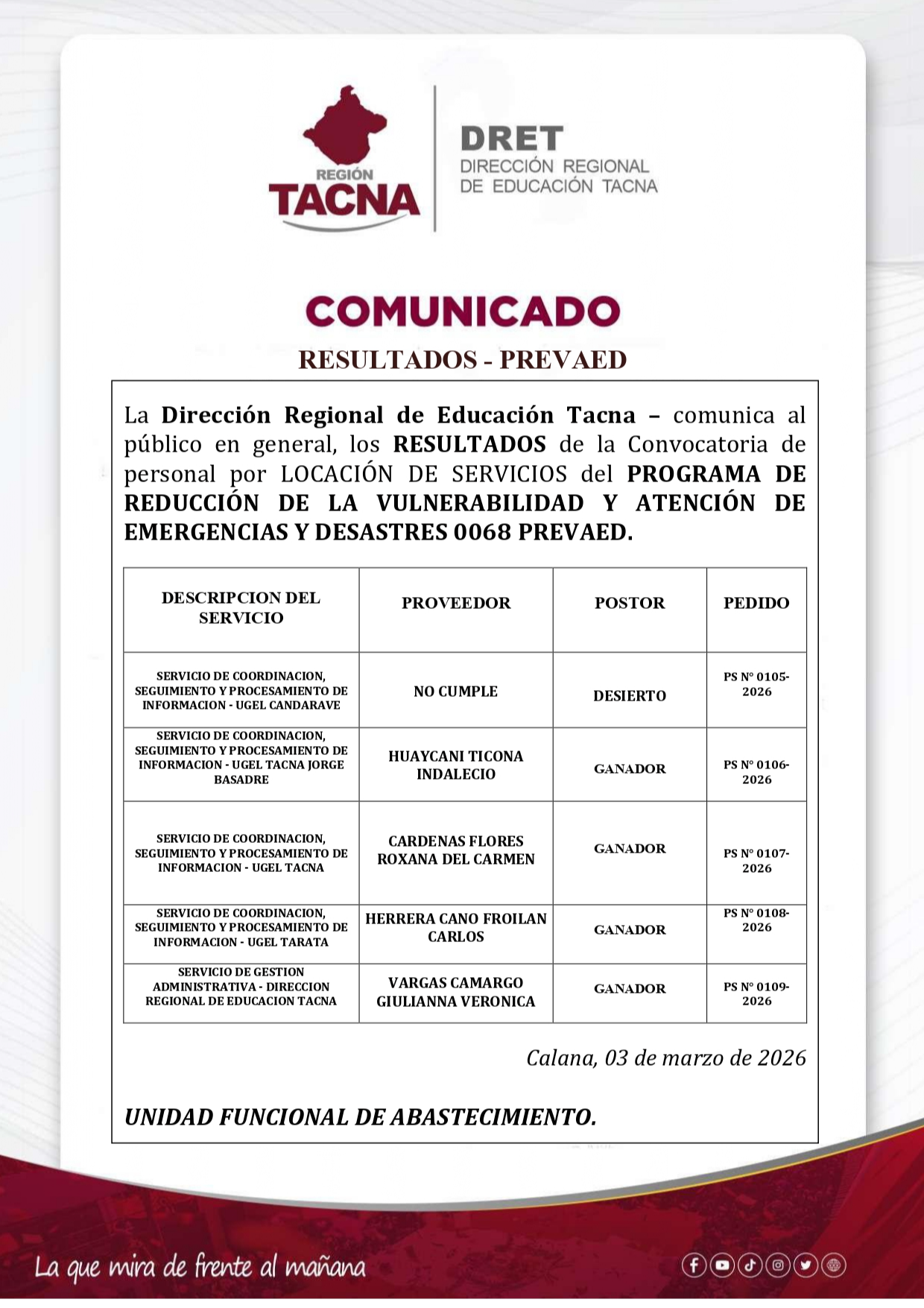 | 216 | RESULTADO DE LA CONVOCATORIA DE PERSONAL POR LOCACIÓN DE SERVICIOS DEL PROGRAMA PREVAED | 03-03-2026 | |