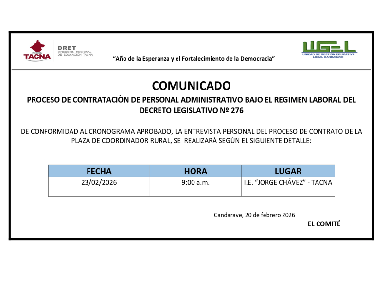 | 212 | PROCESO DE CONTRATACIÒN DE PERSONAL ADMINISTRATIVO BAJO EL REGIMEN LABORAL DEL DECRETO LEGISLATIVO Nº 276 | 02-21-2026 | |